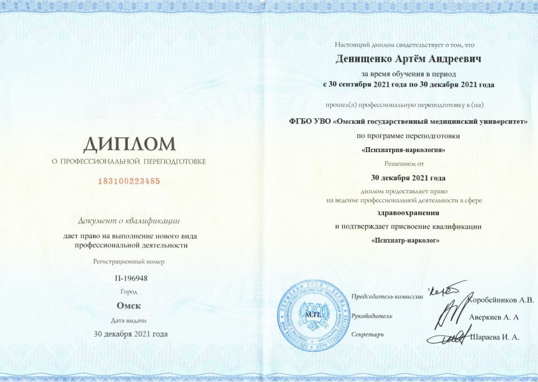 Меня зовут Денищенко Артём Андреевич, и я являюсь психиатром-наркологом в медицинской клинике «Наркология Евро-Клиник». В своей работе я стремлюсь не только лечить заболевание, но и обеспечить условия для поддержания внутренней гармонии и качества жизни пациента.